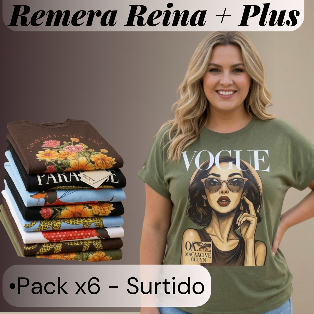 La Remera Reina es el producto más probado de Class. Algodón peinado 100%, suave, durable y con excelente caída. El pack viene con 3 básicas hasta talle XL y 3 plus hasta talle XXXL — así cubrís todos los cuerpos y no perdés ninguna venta por talle.